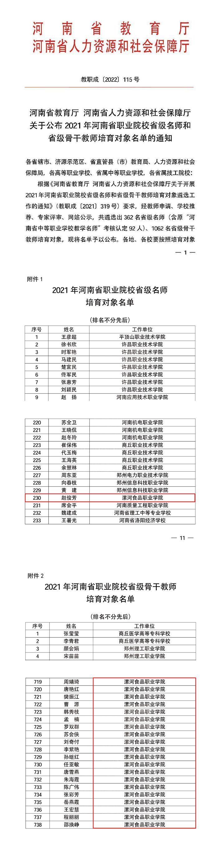 近日,河南省教育厅 河南省人力资源和社会保障厅下发了《关于公布2021年河南省职业院校省级名师和省级骨干教师培育对象名单的通知》(教职成[2022]115号),我院赵俊芳被遴选为省级名师培育对象,周婧琦等20位教师被遴选为省级骨干教师培育对象。... 阅读(1597)