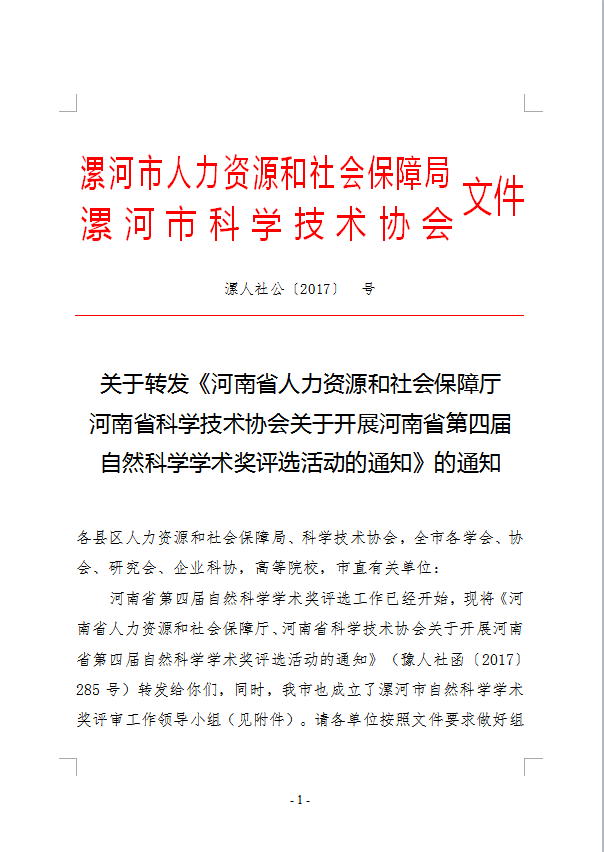 关于转发《河南省人力资源和社会保障厅 河南省科学技术协会关于开展河南省第四届 自然科学学术奖评选活动的通知》的通知