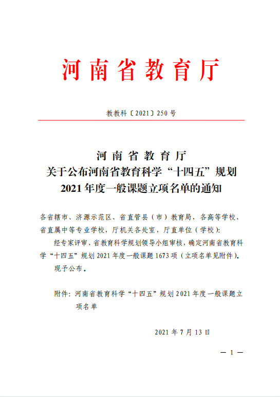 河 南 省 教 育 厅 关于公布河南省教育科学“十四五”规划 2021 年度一般课题立项名单的通知