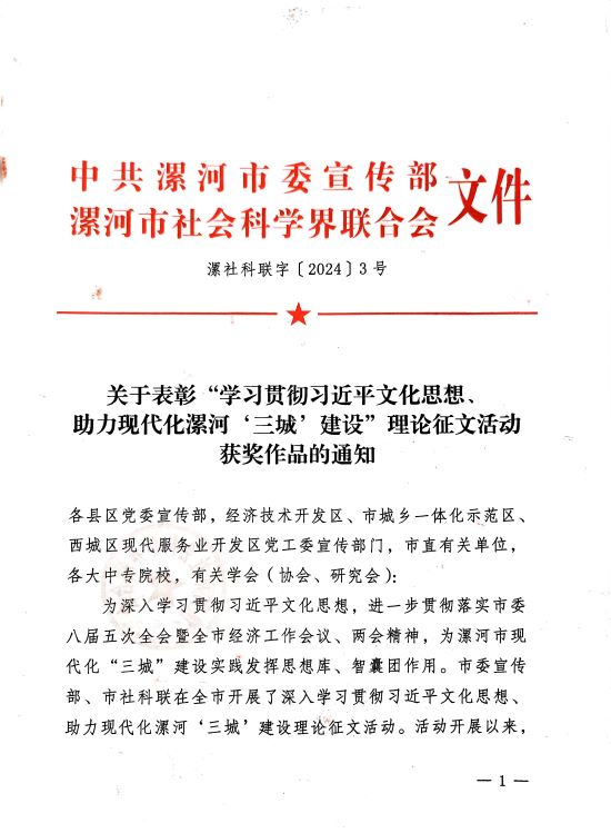 2024/05/31马克思主义学院朱永辉老师文章荣获“学习贯彻习近平文化思想、助力现代化漯河‘三城’建设理论征文活动”三等奖