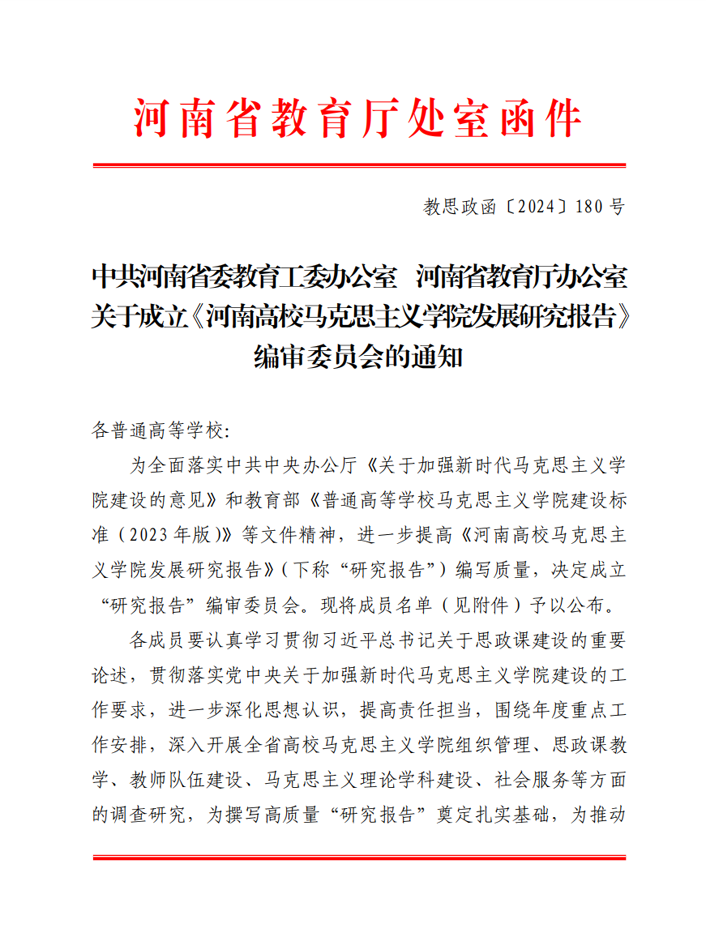 近日,中共河南省委教育工委办公室、河南省教育厅办公室下发《关于成立《河南高校马克思主义学院发展研究报告》编审委员会的通知》(教思政函〔2024〕180 号),决... 阅读(1287)