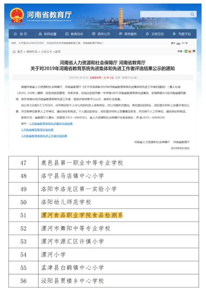8月28号, 河南省人力资源和社会保障厅 、 河南省教育厅 下发《 关于对 2019年河南省教育系统先进集体和先进工作者评选结果公示的通知 》 (豫人社函〔 2019〕210号) , 我院食品检测... 阅读(732)2019/08/26漯河食品职业学院 药品质量与安全专业人才培养方案(2019版)