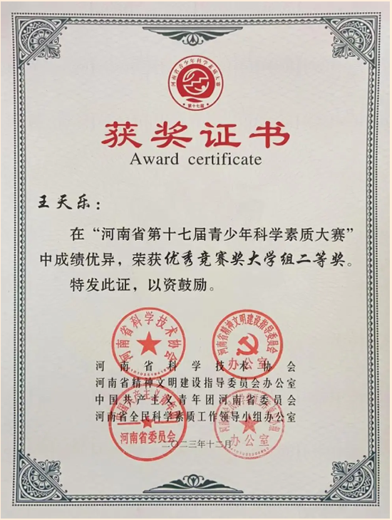 2024/06/28喜报!智能制造学院23级学生王天乐在河南省第十七届青少年科学素质大赛中荣获大学组二等奖