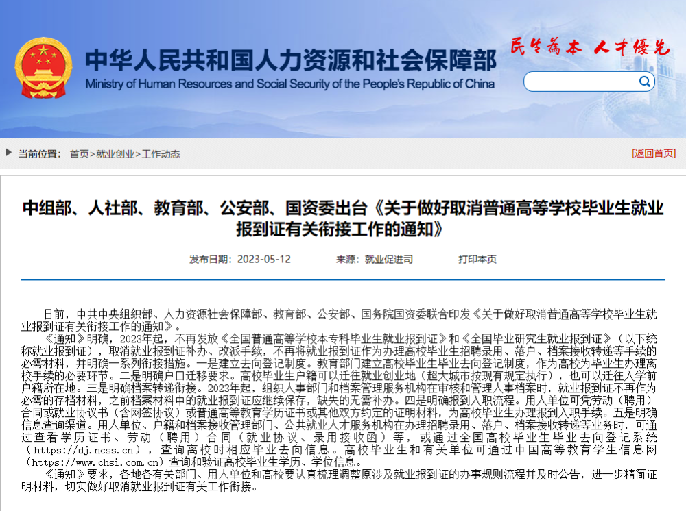 中组部、人社部、教育部、公安部、国资委出台《关于做好取消普通高等学校毕业生就业报到证有关衔接工作的通知》日前,中共中央组织部、人力资源社会保障部、教育部、公安部、国务院国资委联合印发《关于做好取消普通高等学校毕业生就业报到证有关衔接工作的通知》。《通知》明确,2023年起,不再发放《全国普通高等学校本专科毕业生就业报到......