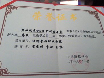 在刚刚结束的2018年移动互联创新大赛河南赛区(高校组)总决赛中,我系教师王黎、翟宏伟、李敏老师带领创新小组成员王慧利、冯佳音、姬立强携带虚拟现实VR医护训练专家项目荣获... 阅读(707)2019/03/08信息工程系在第九届河南省高职院校技能大赛中获佳绩