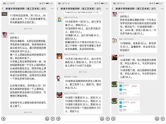 2月11日,按照既定日期线上教学正式开始,网上授课三天以来,老师们与学生同步听课,通过微信群、QQ群、同步课堂、钉钉系统等渠道对学生进行答疑解惑,及时总结学生听课情况,每日上报,确保了学生高效的学习效果。
