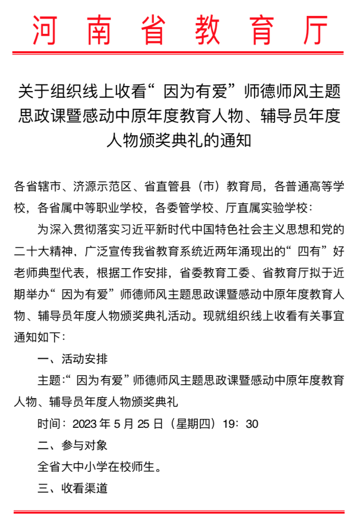 5月25日是全国大学生心理健康日。5·25的谐音即为“我爱我” --提醒大学生“珍惜生命,关爱自己,核心内容是:关爱自我,了解自我,接纳自己,关注自己的心理健康和心灵成长,提高自身心理素质,进而爱别人,爱社会。 大学生对心理健康的概念很模糊,甚至有误解,不到了药物治疗的程度,就不承认自己存在心理障碍。 例如:大学新生的...... 阅读(1122)2023/05/26信息工程系组织教师观看“因为有爱”师德师风主题思政课暨感动中原年度教育人物、辅导员年度人物颁奖典礼活动