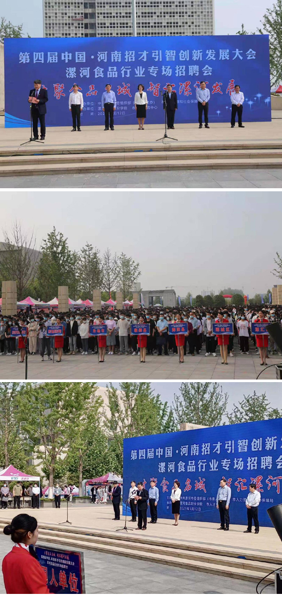 为助力中国食品名城建设,推动漯河食品产业高质量发展,5月12日,第四届中国·河南招才引智创新发展大会漯河食品行业专场招聘会开幕式在漯河食品职业学院隆重举行。省人才办副主任、省委组织部人才工作处处长高志刚,省人才交流中心主任冯以干,市委常委、组织部部长吕娜,漯河食品职业学院党委书记、市委组织部常务副部长张国啸,漯河食品职业学院党委副书记、董事长詹跃勇出席开幕式。漯河市政府副秘书长张合良主持仪式。