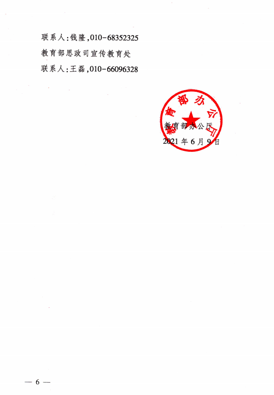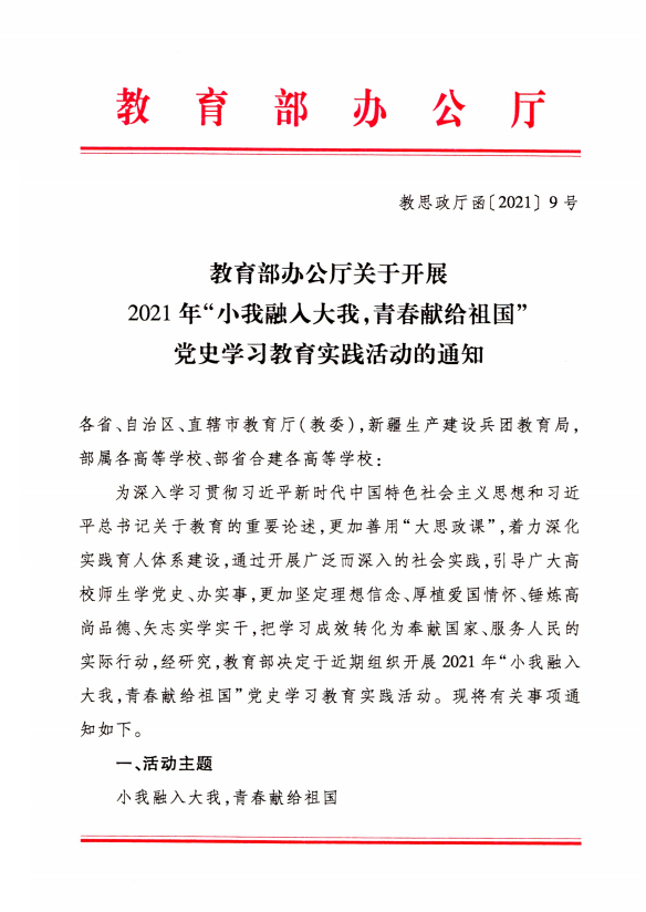 教育部办公厅关于开展 2021年“小我融入大我,青春献给祖国” 党史学习教育实践活动的