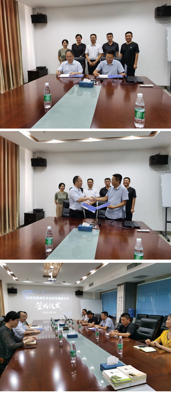 经过我院高愿军教授牵线搭桥,于9月10日,河南省农科院农副产品加工研究所张康逸教授团队与河南新孚望新材料科技有限公司在漯河举行抗性淀粉研发及其应用战略合作签约仪式,漯河市市场监管局王文甫科长、我院副院长高愿军教授、科技处副处长崔胜文参加会议。