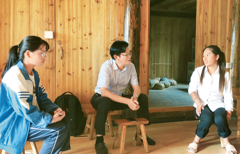 每逢周末或节假日,陈立群都会翻山越岭、走寨访户,家访贫困学生家庭,鼓励家长让孩子完成学业。图为陈立群在台江县南冬村建档立卡贫困学生王宝芝家家访。 新华社记者 李惊亚/摄