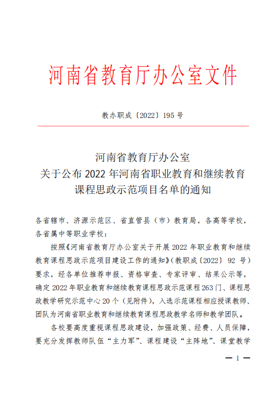 2022/06/24我系申报的3项“2022年河南省职业教育和继续教育课程思政示范项目”全部获批