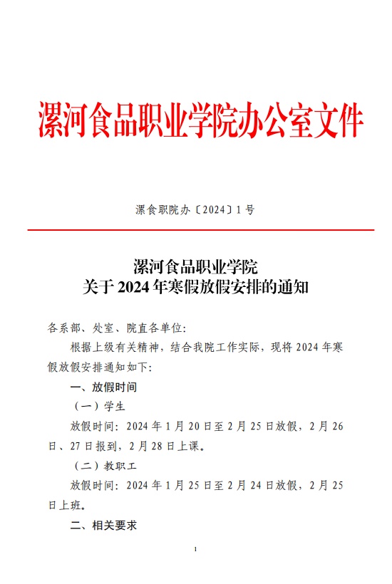 2024/01/09漯河食品职业学院关于2024年寒假放假安排的通知