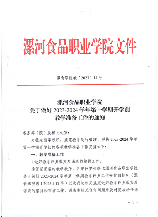 2023/08/14漯河食品职业学院关于做好2023~2024学年第一学期开学前教学准备工作的通知