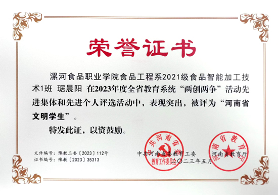 2023/08/16食品工程系在河南省开展2023年度全省教育系统“两创两争”活动中荣获多项表彰