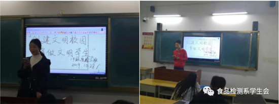 2019年11月13日,19级质检系各班同学们组织了(创建文明校园,争做文明学生)的主题班会活动,为了培养优良学风优化育人环境,从自己内心深处反省,增强文明意识,养成文明的良好习惯,通过本次活动,使学生充分认识到文明创建的重要性,文明建设就在我们身边,我们应当从身边小事做起,用精神来引领行动,从行动上到精神上做到一个文明的大学生。通过本次活动,意识到大学生在文明建设中的巨大作用。并且以全面提高学生的思想道德素质和文明礼仪素养为着重点,将主题宣传活动、行为规范实践以及学校的各项教学活动紧密结合,与社会实践结合,达到教育的目的。