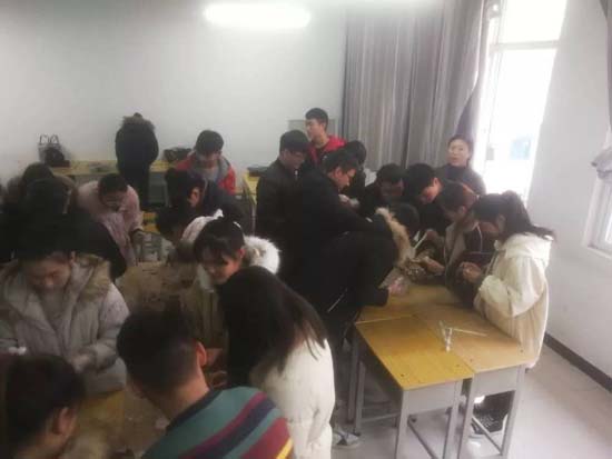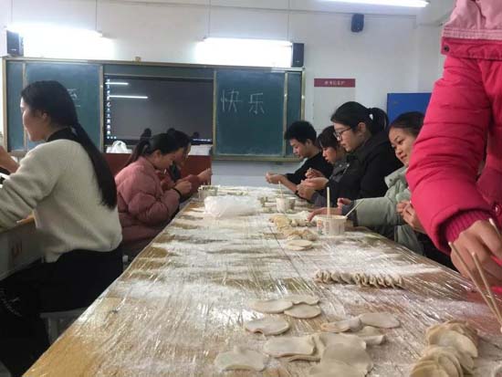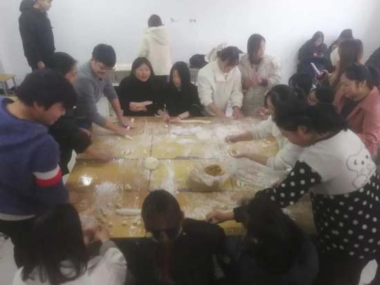 同学们围坐在一起,都开始亲手实践。虽然出现了奇怪的饺子,但那是每个人亲手创造的成果,同时更体现了各个地方的不同风俗和饺子样式。大家围绕学习、生活、工作等话题,大家不时交谈着。每组同学别出心裁地包着饺子并设计成各种形状,有精致小巧的柳叶饺,有个大饱满的东北饺。