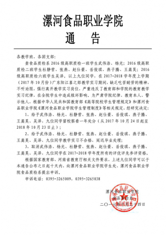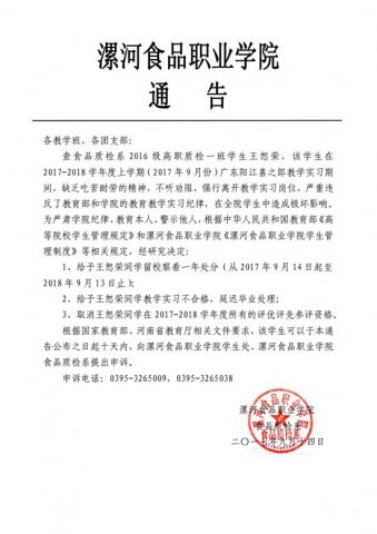 各教学班、各团支部: 查食品质检系2016级高职质检一班学生王恕荣,该学生在2017-2018学年度上学期(2017年9月份)广东阳江喜之郎教学实习期间,缺乏吃苦耐劳的精神,不听劝阻,强行... 阅读(599)