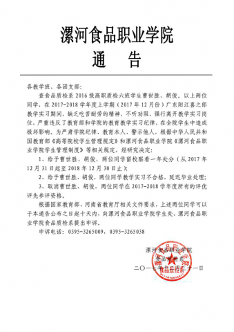 各教学班、各团支部: 查食品质检系2016级高职质检六班学生曹世胜、胡俊。以上两位同学,在2017-2018学年度上学期(2017年12月份)广东阳江喜之郎教学实习期间,缺乏吃苦耐劳的精神... 阅读(1008)