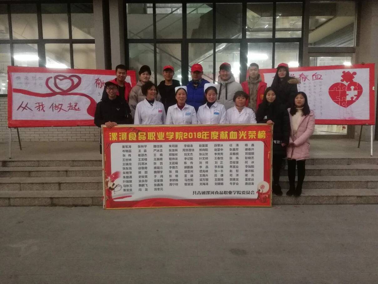 无偿献血是人间传递真情的红色纽带,是中华民族传统美德。2018年12月10—11日,我院青年志愿者协会协助漯河中心血站于学院贾湖餐厅南门举行了为期2天的无偿献血活动,共计175人次献血,献血65000ml。