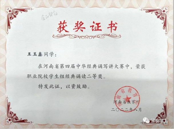 食品工程系2021级2班王玉鑫同学在河南省第四届中华经典诵写讲大赛中,荣获职业院校学生组经典诵读二等奖。...