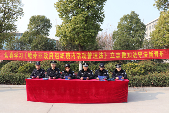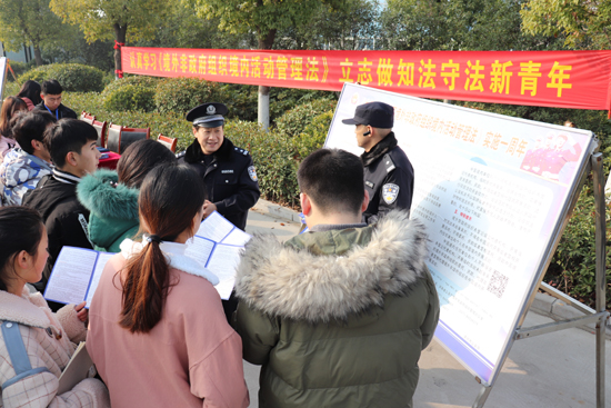 为认真宣传落实《境外非政府组织境内活动管理法》,12月20日上午,漯河市公安局干警在市局领导的带领下到我院开展《境外非政府组织境内活动管理法》(以下简称《管理法》)普法宣传活动,漯河市公安局副局长武胜伟,沙北公安分局、郾城区公安分局、孟庙派出所等有关领导同志莅临宣传现场,我院主管副院长、学生处、保卫处相关负责人和部分师生参加了宣传活动。