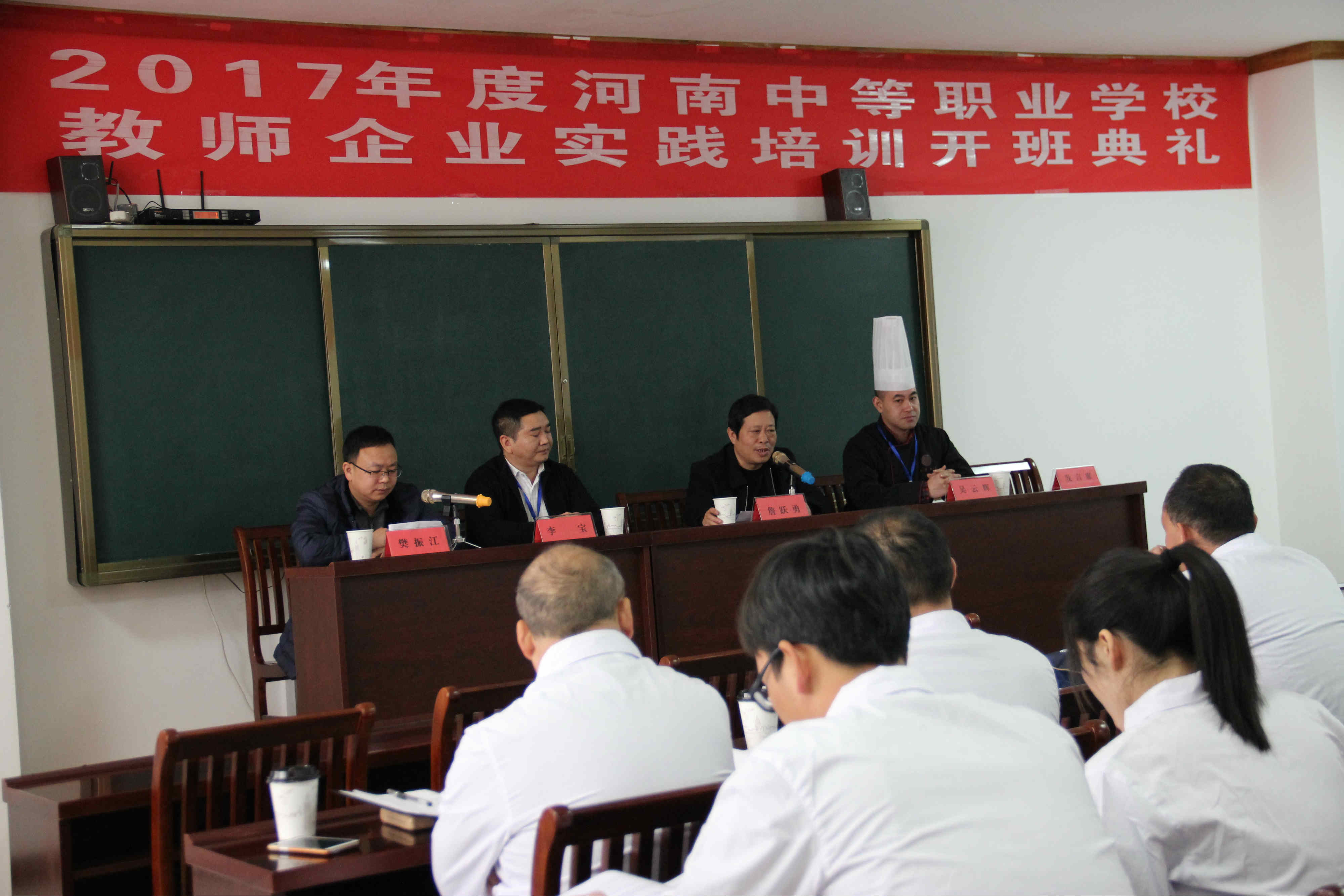 2017年12月11日,我院举行2017年度河南省中等职业学校教师企业实践培训班开班典礼。前来参加开班仪式的领导有院党委书记詹跃勇,院长助理实训中心主任樊振江,河南大匠烘焙教育科技有限公司经理李宝等参加,该培训班由院实训中心主办,河南大匠烘焙教育科技有限公司承办,为期50天的培训。