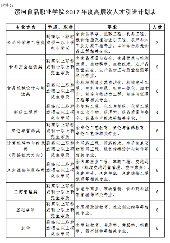 详见《漯河食品职业学院2017年度高层次人才引进计划表》(附件1)